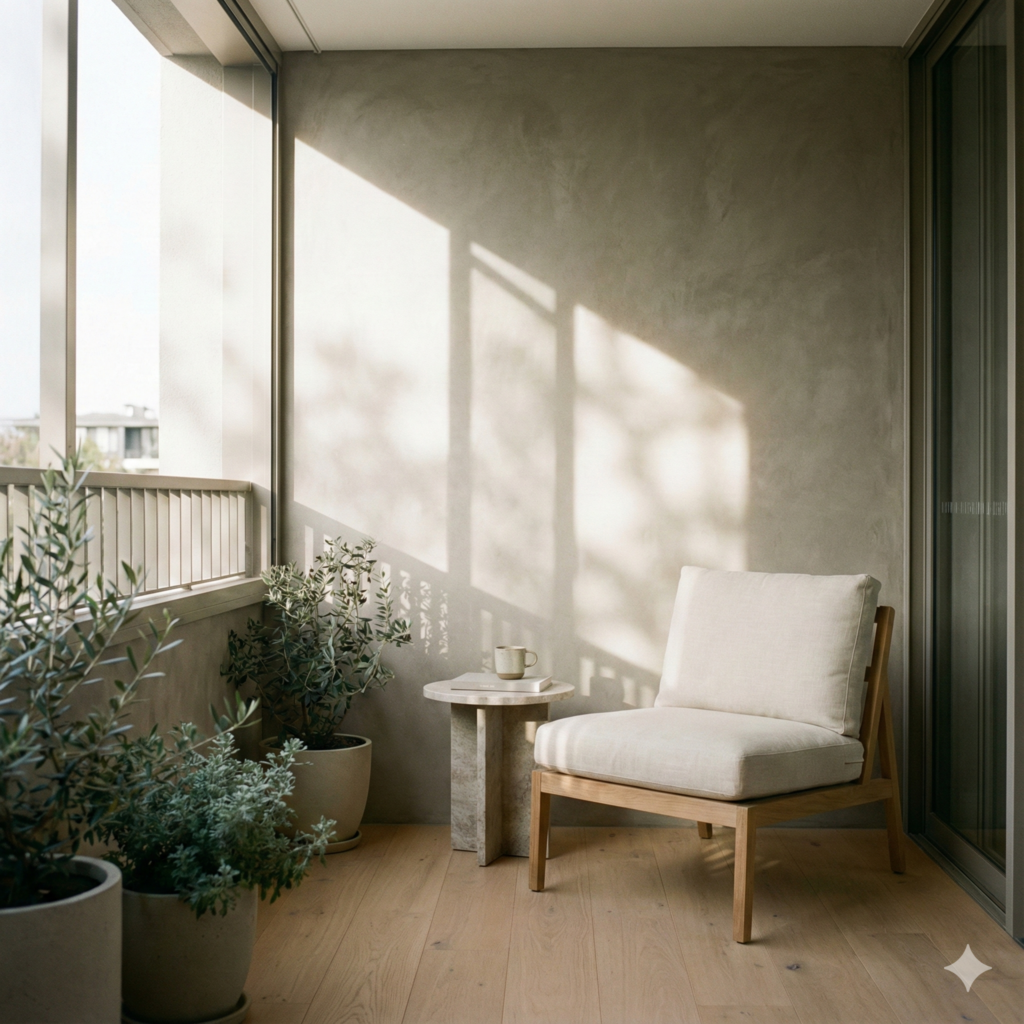 This one could be a close-up shot showcasing the fine materials and construction quality of a Mont Vert building, like the texture of the facade, a well-crafted balcony, or the quality of the window fittings.)